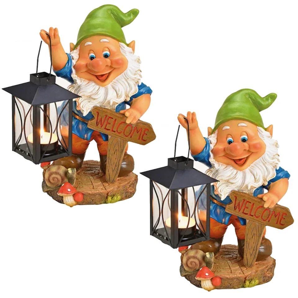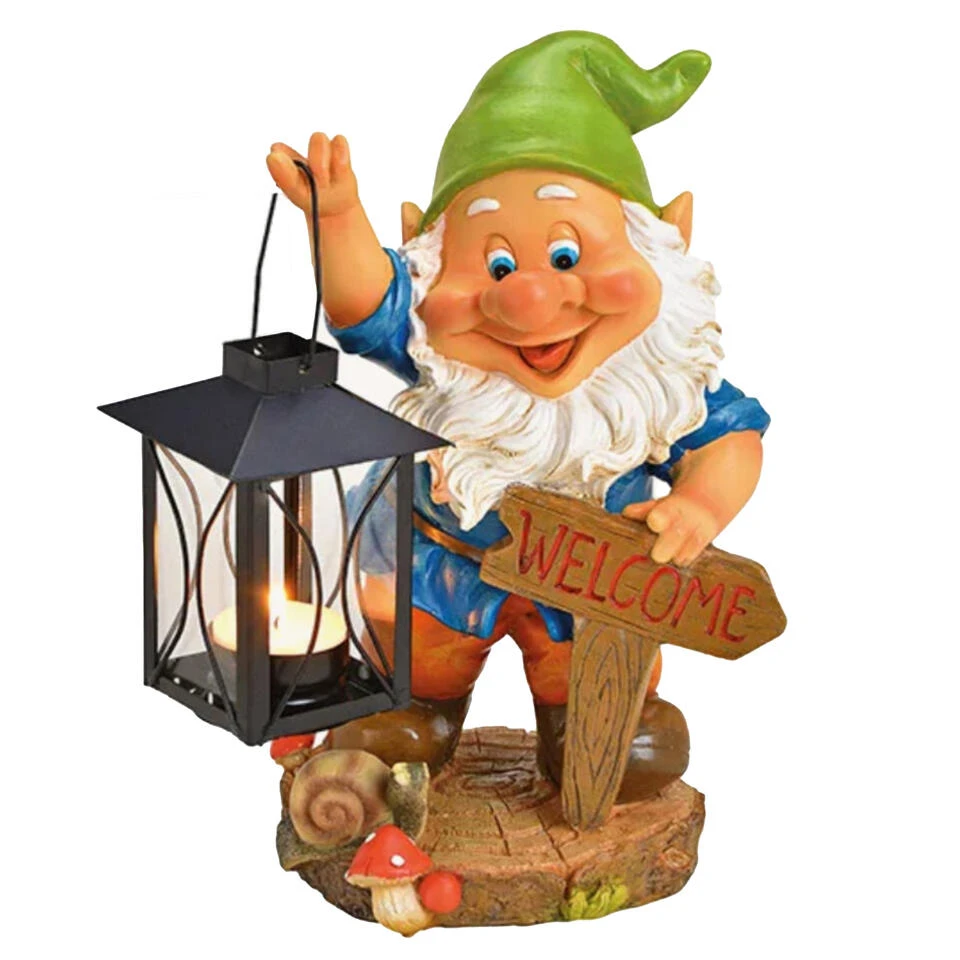 Tuinkabouter met lantaarn en welkom bordje. Dit tuinkabouter beeld heeft een formaat van ca. 20 x 15 x 26 cm en is gemaakt van polystone. Tuindecoratie/tuinversiering kabouters.