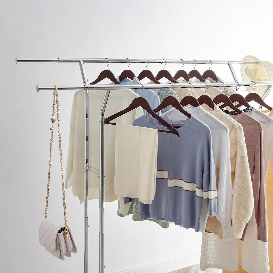 STABIEL EN TOT 110 KG DRAAG CAPICITEIT: De hoek van de bovenste schuine stangen is opnieuw ontworpen, een goede stabiliteit is verzekerd, het kledingrek kan nagenoeg niet kantelen. De schoor aan de zijkant wordt gebruikt door speciale haken aan de paal, zelfs onder belasting is hij zeer sterk. Aan het buiseinde van de bovenste schuine stangen is de diameter in 3 dimensies, door deze speciale bewerking van het buiseinde zijn de stangen bijzonder stevig verbonden