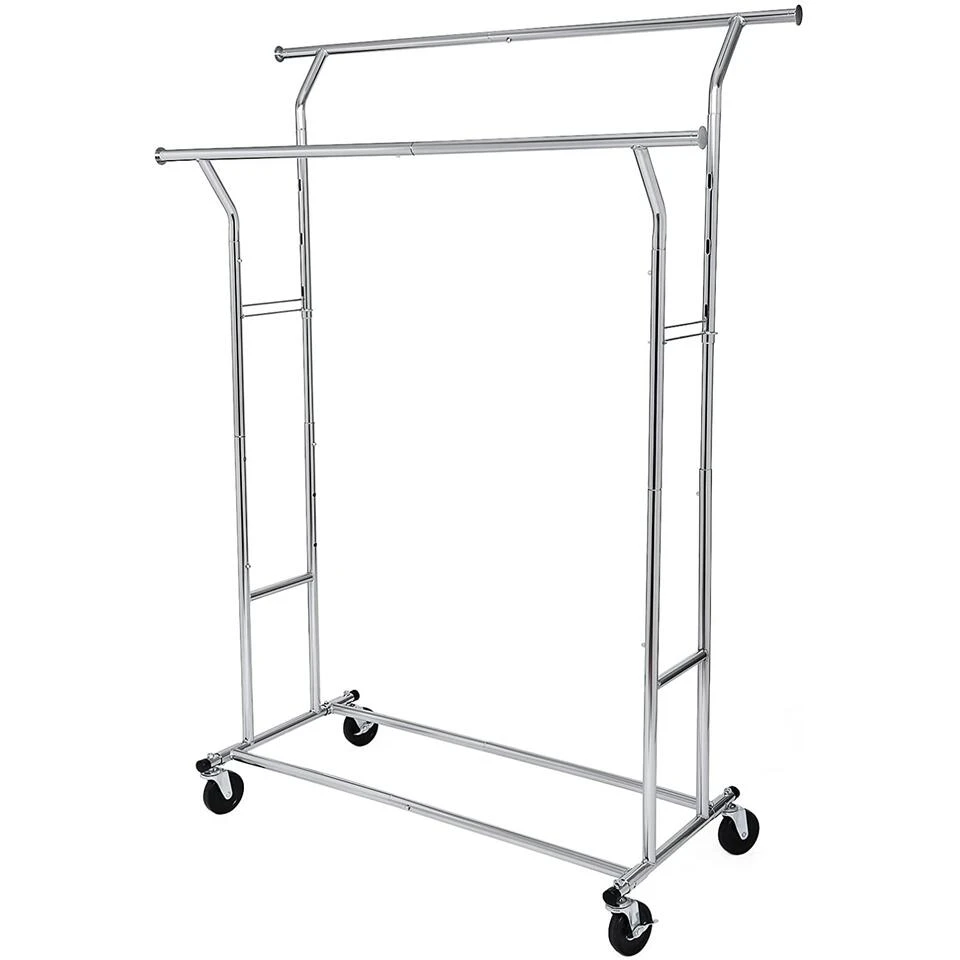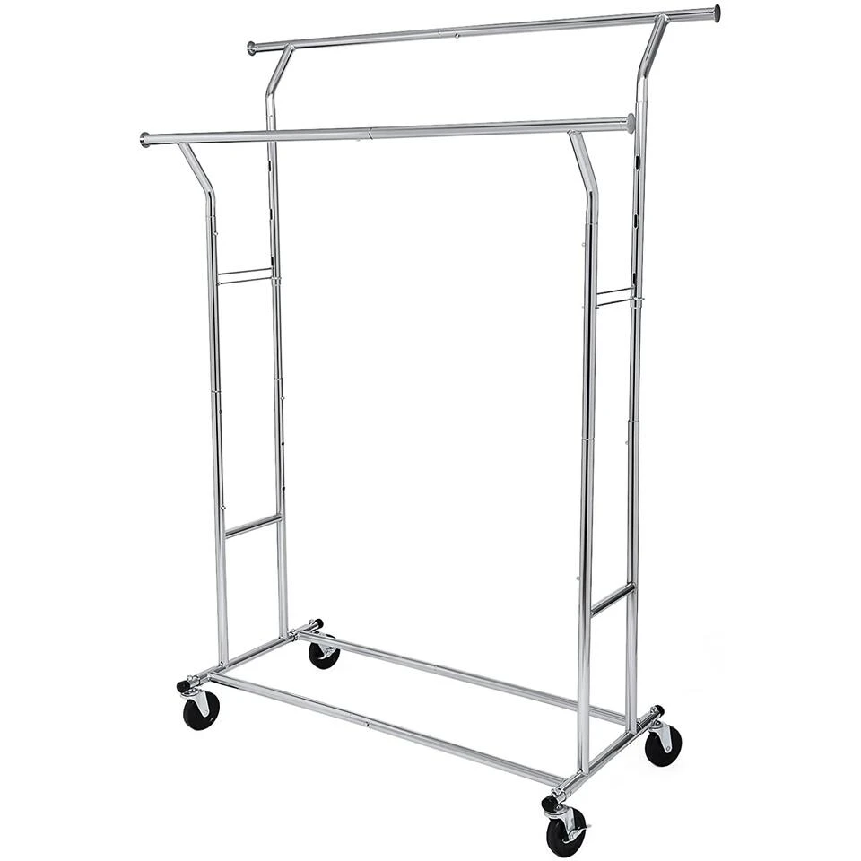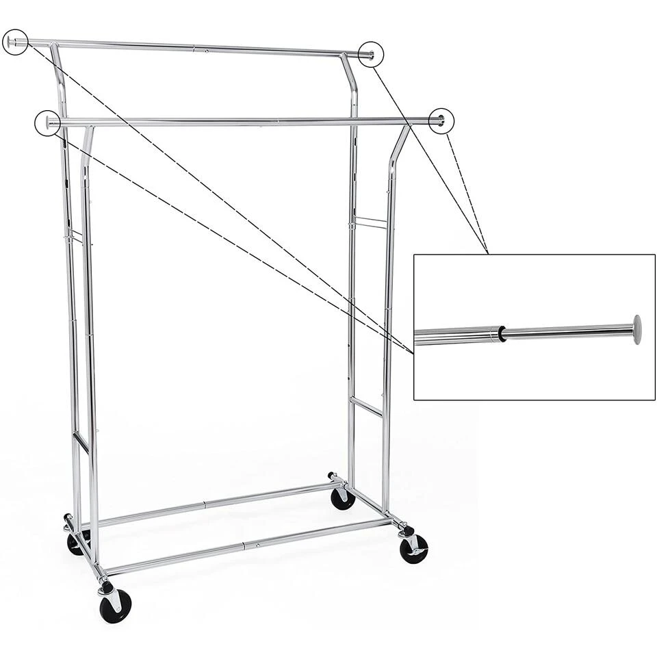 4 INDUSTRIELEN WIELEN: In tegenstelling tot de nylon rollen zijn deze heavy duty wielen groter en ook gemakkelijker te manoeuvreren, zelfs bij volle belasting (110 kg) kan je het kledingrek nog goed manoeuvreren. 2 wielen met remmen, indien nodig kunnen ze worden vastgezet. ook geschikt voor de textieldetailhandel, voldoet aan de commercial eisen.