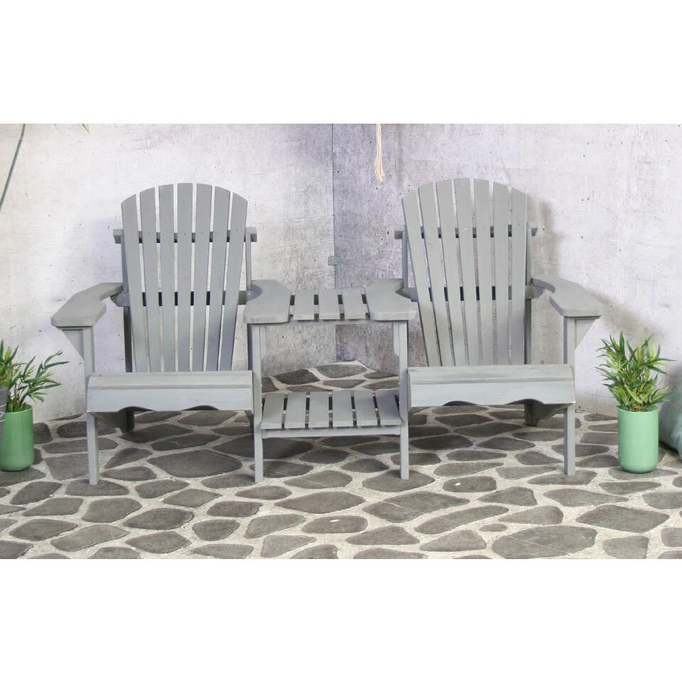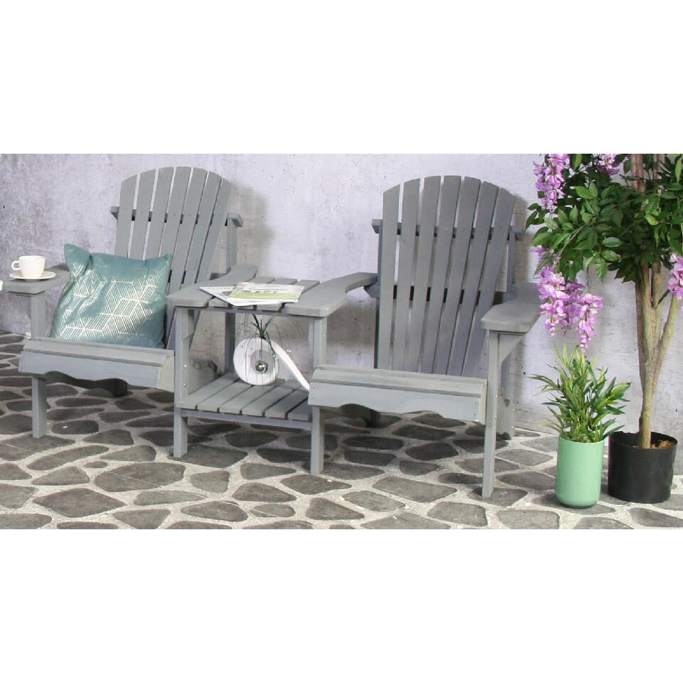 Met deze dubbele tuinstoel haal je Canadees design en comfort naar je eigen tuin. Het tuinbankje heeft 2 zittingen heeft een diepe zit en fijne hoge rugleuning. Daarnaast biedt het tafeltje in het middenΒ plek voor een verkoelend drankje.
