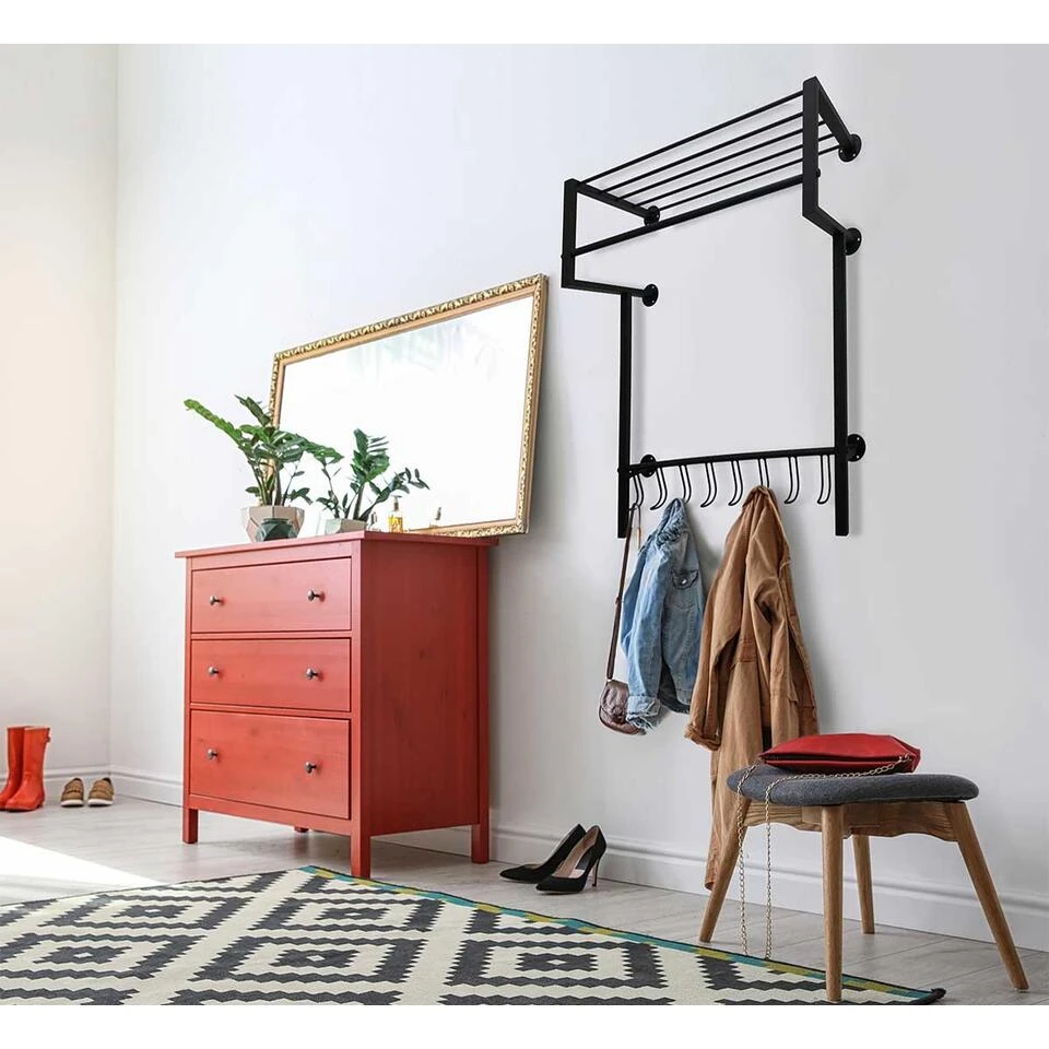 Functionele kapstok gemaakt van rechthoekige en ronde buizen en die is voorzien van 8 haken. Tevens is deze kapstok voorzien van een roede voor kleding hangers en een legplank om kledingstukken (of accessoires) op te leggen.